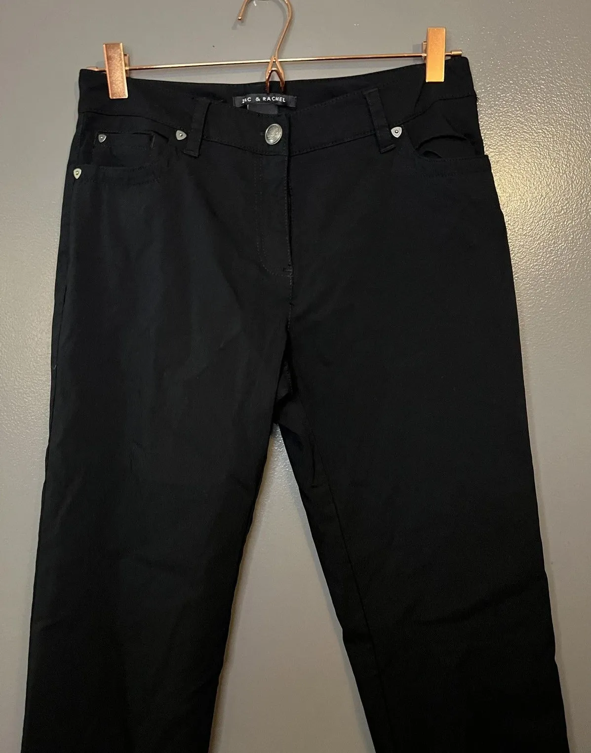 Brand: Zac & Rachel Item: Women's dress/career pants Color: Black Tag size: 8 Fabric: 76% Rayon, 21% Nylon, 3% Spandex Made in Sri Lanka RN: 103715 Style/Design: Classic straight leg silhouette with comfortable stretch Features: Zip fly with silver-tone button closure (crest detail), belt loops Features: Front pockets with rivet details; back welt pockets Care: Machine wash cold inside out on gentle cycle; do not bleach; tumble dry low; warm iron if needed (per care tag) Notes: Solid black versatile career/office trousers; see photos for details. Waist 30" Rise 9" Inseam 30" Bin 11