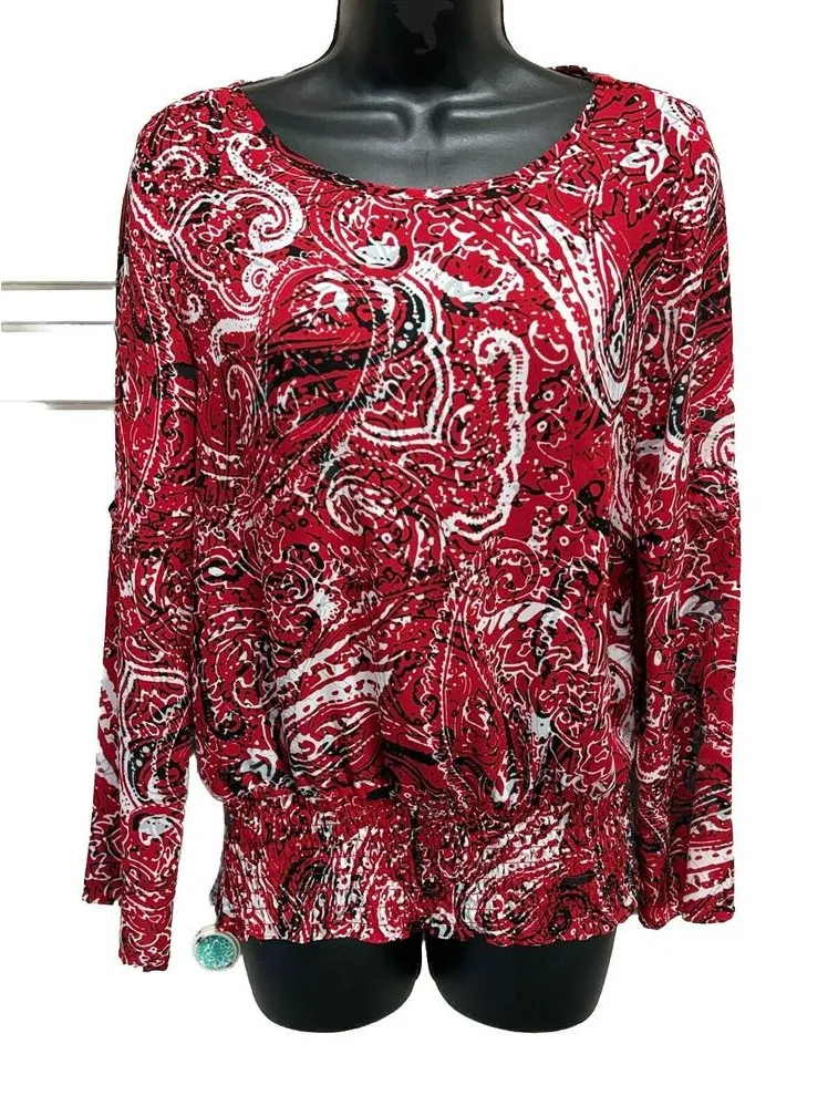 Elevate your wardrobe with this stunning Zac & Rachel blouse. The boat neckline and pullover closure make it easy to wear, while the smocked waist adds a touch of elegance. Perfect for any occasion, from travel to business, this lightweight and breathable chiffon blouse is a must-have. Featuring a beautiful paisley pattern in black, red, and white, this blouse is perfect for the bohemian, city, or classic theme. The long sleeves and casual sleeve type make it suitable for all seasons, while the slimming and easy-care features ensure a comfortable fit. This blouse is available in size S, with a 19" pit to pit, 28" waist and a 24.5" length. Add this versatile and stylish blouse to your collection today. (1065)