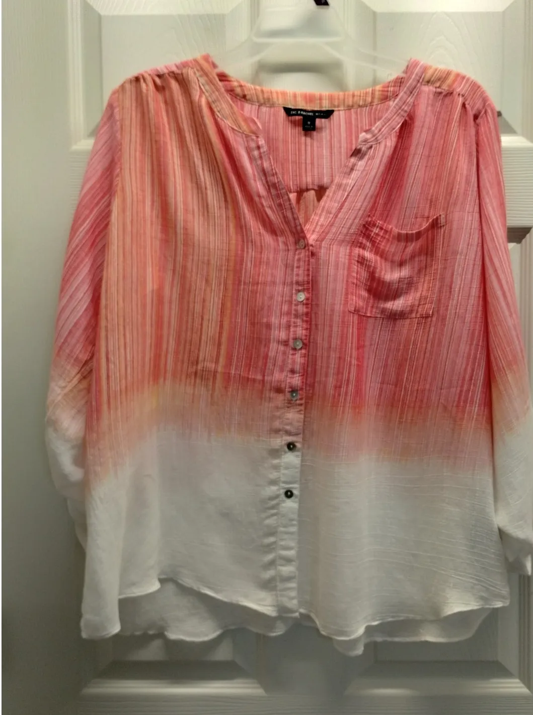 Zac & Rachel Women's Plus Size 1X Orange Pink Ombre Striped Button-Up Roll-Tab Sleeves Top Split V-Neck - Long Sleeves with Roll-Tab Feature- One chest pocket Excellent preowned condition, see photos. 27 inches pit to pit. 27 1/2 inches long.