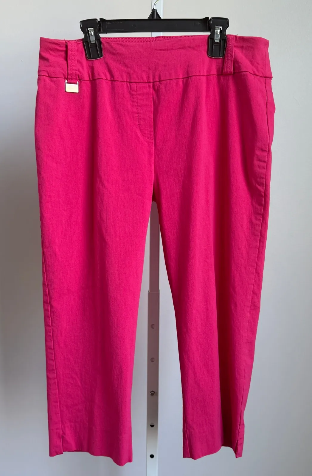 Zac & Rachel sz 10 pink work office cropped dress pants Gently used with no flaws These are pre-owned Zac & Rachel capri pants, size 10. The pants are bright pink and made of 76% rayon, 21% nylon, and 3% spandex. They feature a flat front with a metal accent on the left side, faux back pockets, and a cropped length. There are no visible stains or tears, but some minor wrinkling is present from previous wear. Measurements: Armpit to armpit: Waist: 32" Hips: 40" Length: 29" Inseam: 20" #A045 Weight: 12 oz All thrifted items have been carefully washed with hypoallergenic laundry detergent and packaged with love.