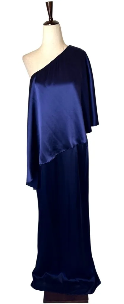 This navy blue satin maxi dress features a one-shoulder design and elegant draped detailing, offerin... Show more