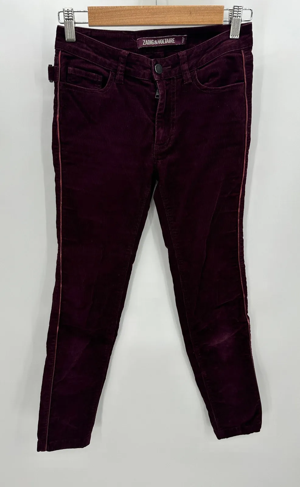 Eva Velours purple skinny corduroy pants. Zip fly with button closure, belt loops, cotton blend. Size: 34 Condition: Pre-owned. Good Condition. Has wear on the stripe area and under the knee on leg. Please see photos for more details and measurements. Thanks!! AE2 Features: Bottoms, Pants, Casual, Everyday, Pants, Work, Office