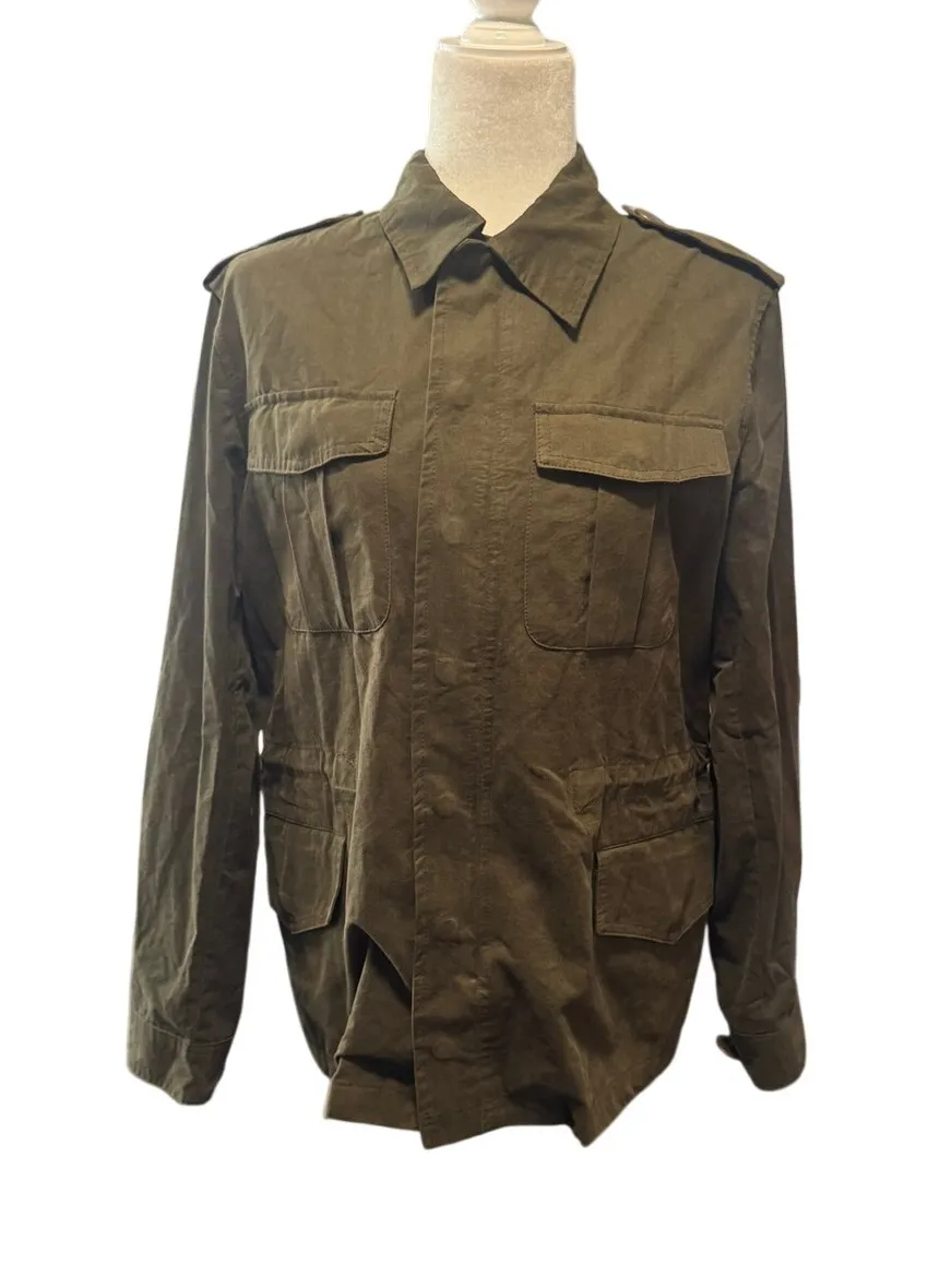 Zadig & Voltaire Kayak Bis Khaki Military Jacket Embroidered Green Skull Guitar Angel on Back- Size Small Material: 100% cotton Color: Classic army khaki Back Detail: Large, intricate angel & guitar embroidery with metallic threads and layered texture Front: Zip + button closure, dual flap chest pockets, oversized hip pockets Design Details: Epaulettes, adjustable waist cinch for shape, structured collar, long sleeves with button cuffs Pre-owned, very good — light natural wear consistent with cotton utility jackets but no visible flaws Relaxed utility silhouette with optional waist shaping Measurements Length: 24” Shoulder: 16” Pit to Pit: 20” Sleeve: 24” embroidered jacket, military jacket, boho rocker, festival fashion, utility jacket, embellished jacket, statement jacket, rocker chic, luxury boho, grunge, indie, goth, edgy