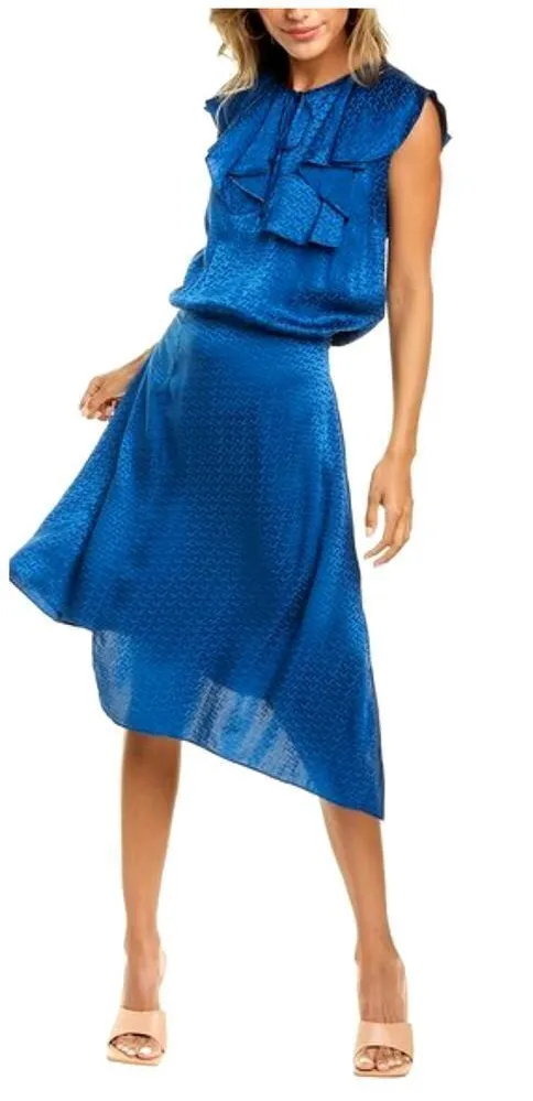 Gorgeous dress by Zadig & Voltaire. The Racky Jac Silk Midi Dress is made in a stunning ocean blue color with keyhole neck with self-tie closure, ruffled overlay and asymmetrical hem 100% silk Size XS Armpit to armpit - 17'' Waist - 13'' Approximately 55in from shoulder to hem Excellent pre owned condition, no flaws OF8