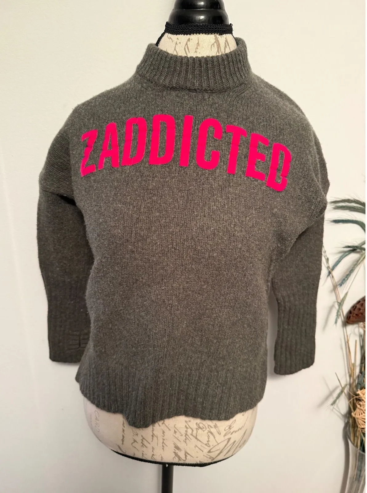Zadig & Voltaire merino wool sweater in green . Mock neck with 'ZADDICTED' graphic in bright pink ac... Show more