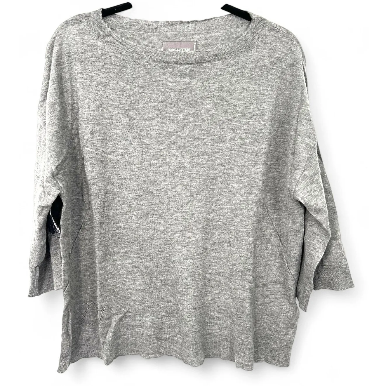 zadig voltaire star elbow Description & details - The Cici Patch Cashmere Sweater combines premium craftsmanship with distinctive detailing for an elevated everyday look. - Made from ultra-soft 100% cashmere, it offers exceptional warmth, breathability, and a luxurious feel. - Features silver-colored leather star elbow patches, adding a bold and stylish contrast to the classic design of this women’s elbow patch sweater. - Designed with a round neckline, ribbed trims at the collar, cuffs, and waist, ensuring a comfortable and flattering fit. - Subtle pointelle ZV signature detailing completes the look, showcasing the brand’s signature elegance. - Perfect for layering or wearing on its own, this women’s elbow patch sweater seamlessly blends sophistication and modern edge. Model is 178 cm / 5' 10" and is wearing a size S This item is true to size. We recommend buying your usual size. Composition 100% CASHMERE gcs As a partner of The Good Cashmere Standard by AbTF, we support sustainable cashmere production. https://thegoodcashmerestandard.org/ The cashmere for this product is produced according to The Good Cashmere Standard® by AbTF Approx. Measurements Laying Flat: 24" Length (Shoulder to Hem) 24" Width (Armpit to Armpit) Very gently used, pre-loved item - no obvious flaws or significant wear.
