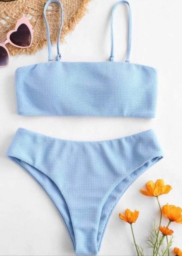 Blue Bandeau Bikini; Fits true to size; worn once and in good condition; two stains; comes with stra... Show more
