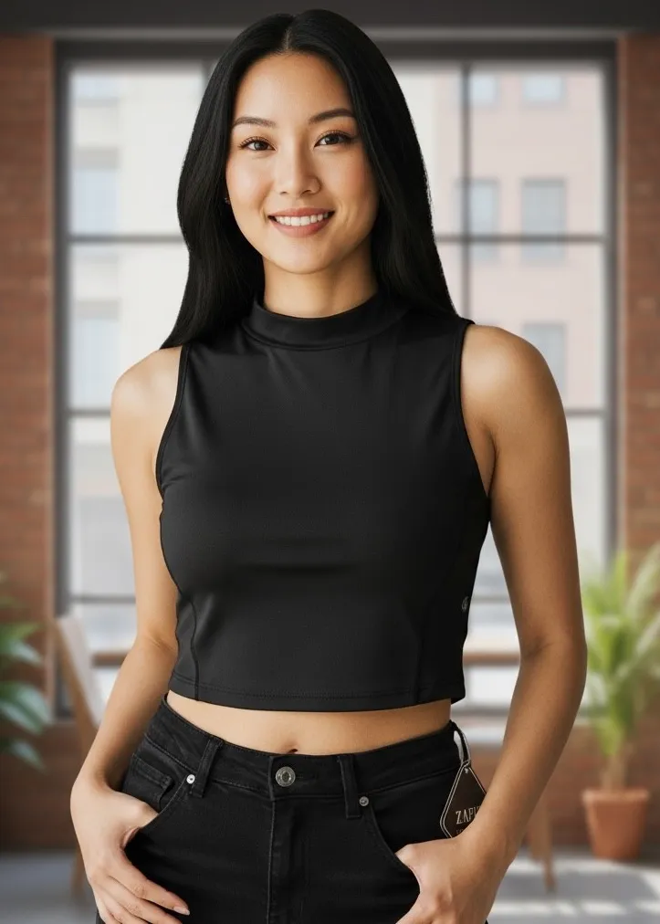Elevated minimalist, this sleek black crop top brings a touch of modern sophistication to any ensemble. Crafted with a high mock neckline and sleeveless design, it offers a streamlined silhouette that's both flattering and chic. The cropped length makes it perfect for pairing with high-waisted bottoms, while the smooth fabric feels luxurious against the skin. This top is the secret weapon your wardrobe needs. Rock it with confidence at a stylish brunch, a casual evening out, or even a chic workout session.