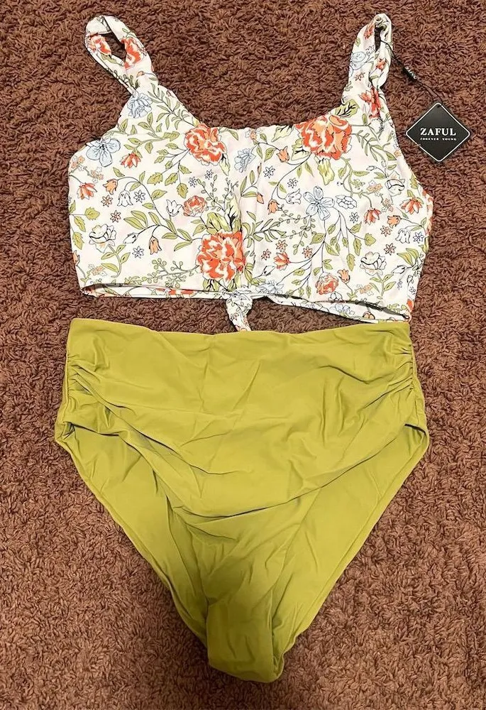 Keywords: ZAFUL, tankini, boho, floral print, high-waisted, adjustable straps, swimwear, beachwear, pool party, green, women's swimwear, stretchy fabric, summer fashion, new with tags, x-large size.