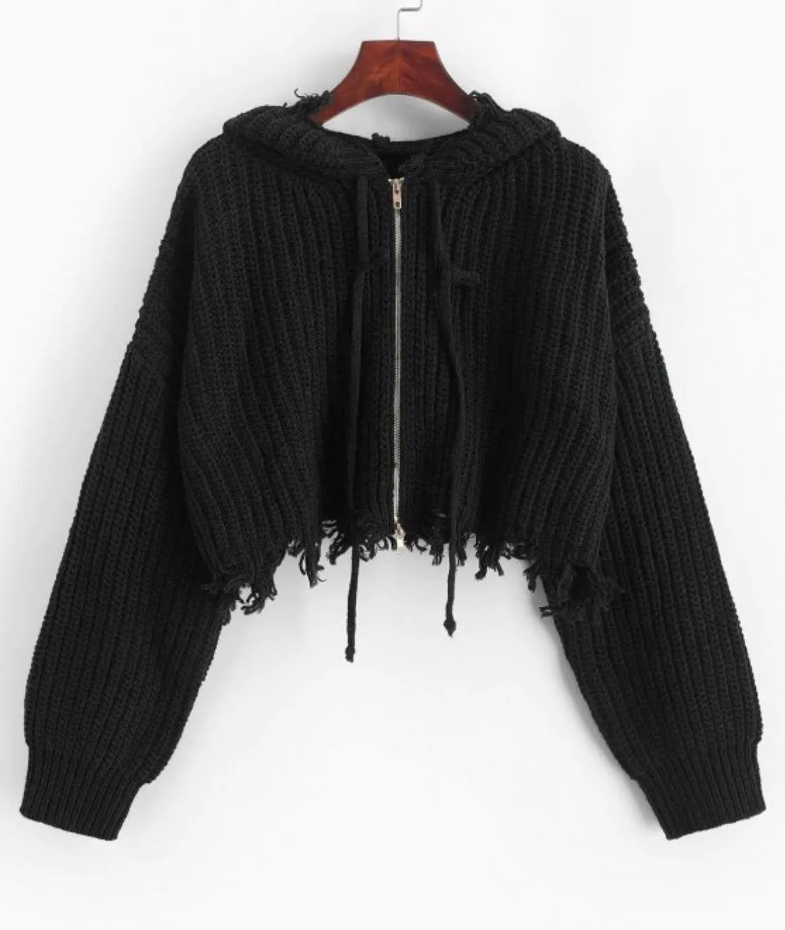 Black zip up Sweater material so kinda heavy The “ripped” edges tend to come off very easily