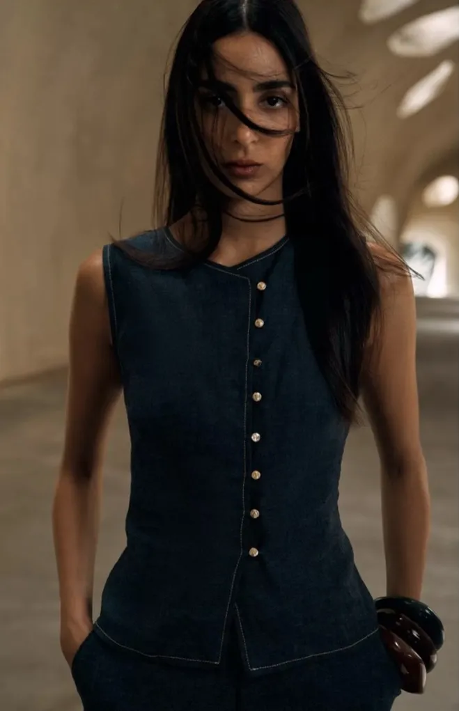 ZARA 100% Linen Double Breasted Vest Navy Blue Size XS Nautical Clean Girl - $52 - From Decerry