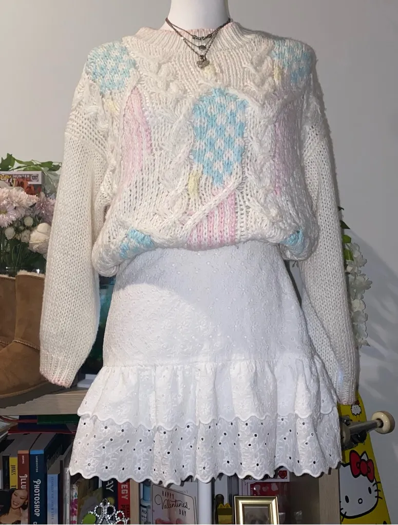 ♡✧゚cute 90s vintage style girly whimsical white lace tiered eyelet mini skirt w/ ruffles ✧・゚ ~ Size... Show more