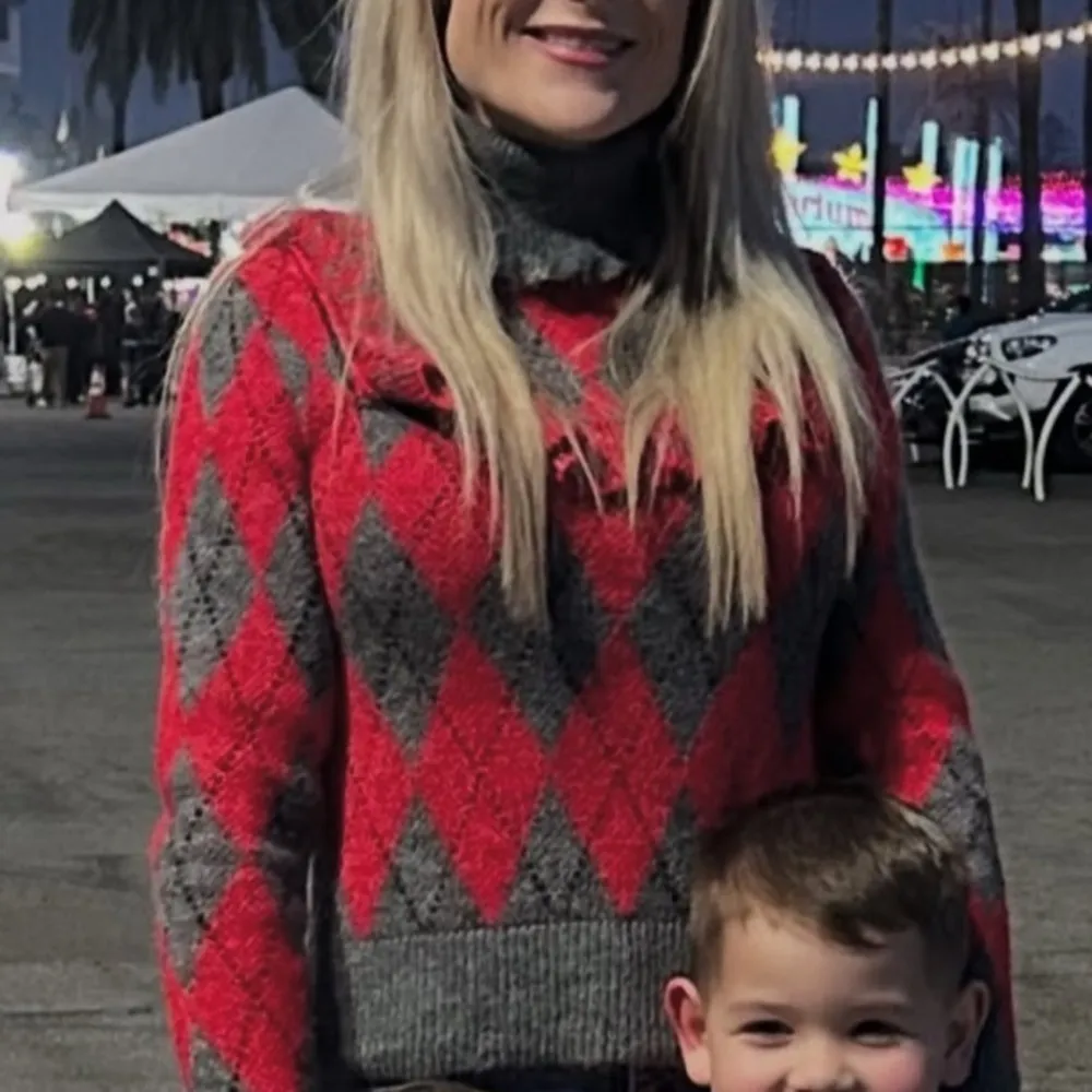 Worn one time by me. Excellent pre-loved condition! The Zara sweater is a red and gray, long-sleeved... Show more