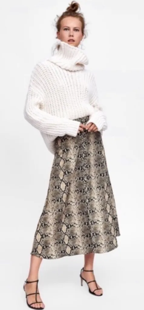 Chic A-line skirt with a bold snake print. Versatile and stylish for any occasion. Soft sweater/knit... Show more