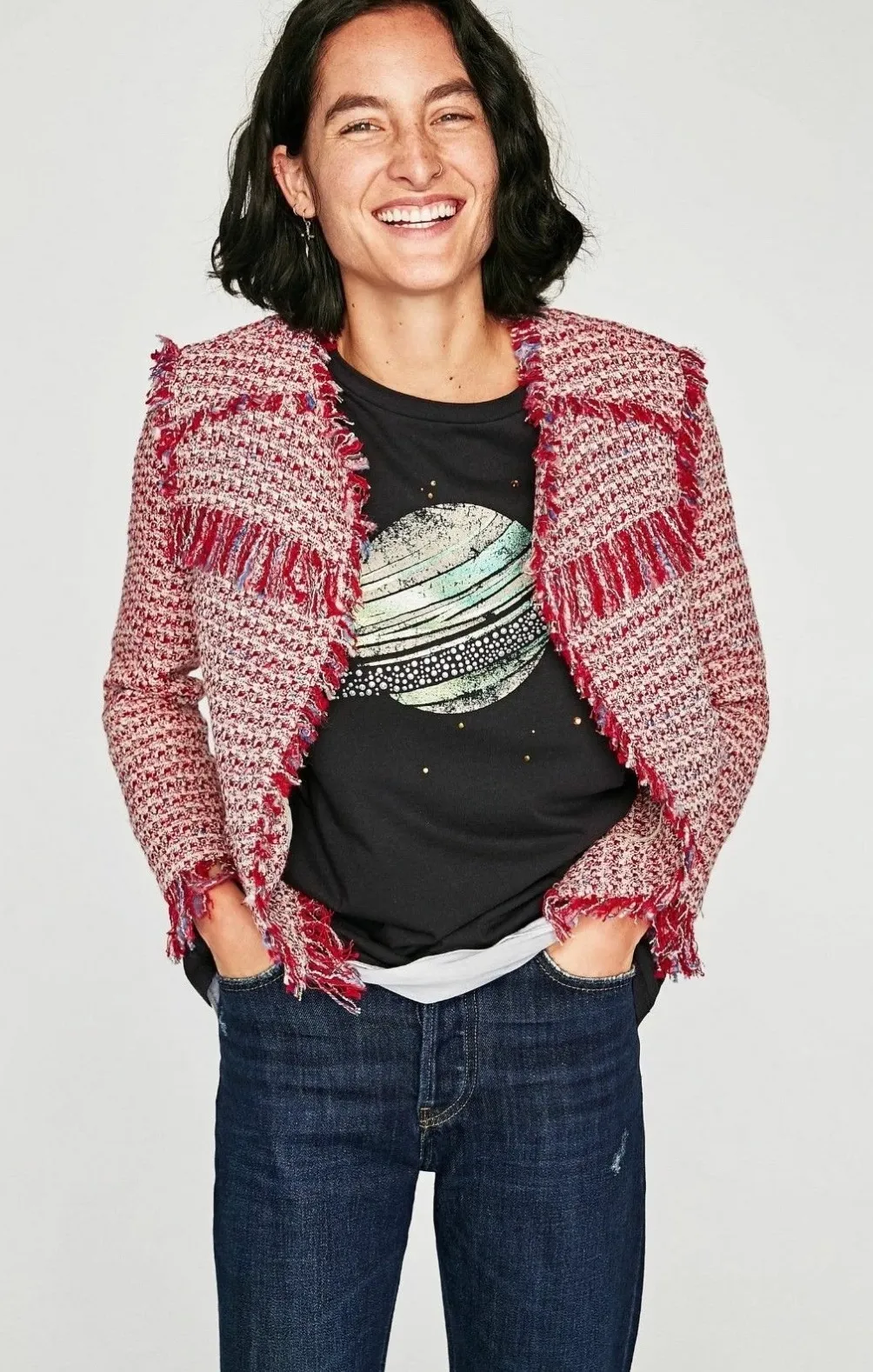 Keywords: Zara jacket, Tweed jacket, Fringe jacket, Red jacket, Womens jacket, Designer jacket, Boho jacket, Chic jacket, Cropped jacket, Statement jacket, Fashion jacket, Zara Basic Collection, Morocco made, Buttonless jacket, Blogger Favorite, Statement