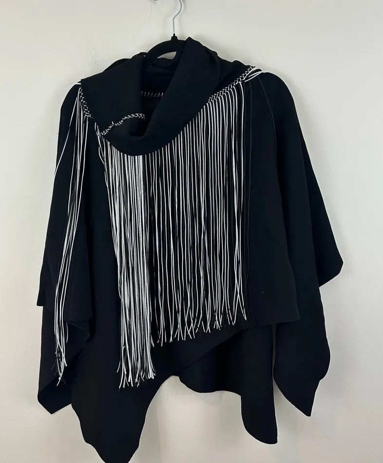 Excellent used condition black shawl poncho. Fringe all the way around. Small pulled threads on the... Show more