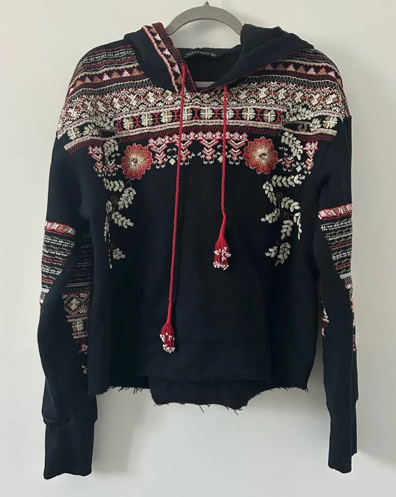 Zara Women Black Beaded Boho Embroidered Cropped Hooded Sweater Size Small Fabric Cotton Polyester... Show more
