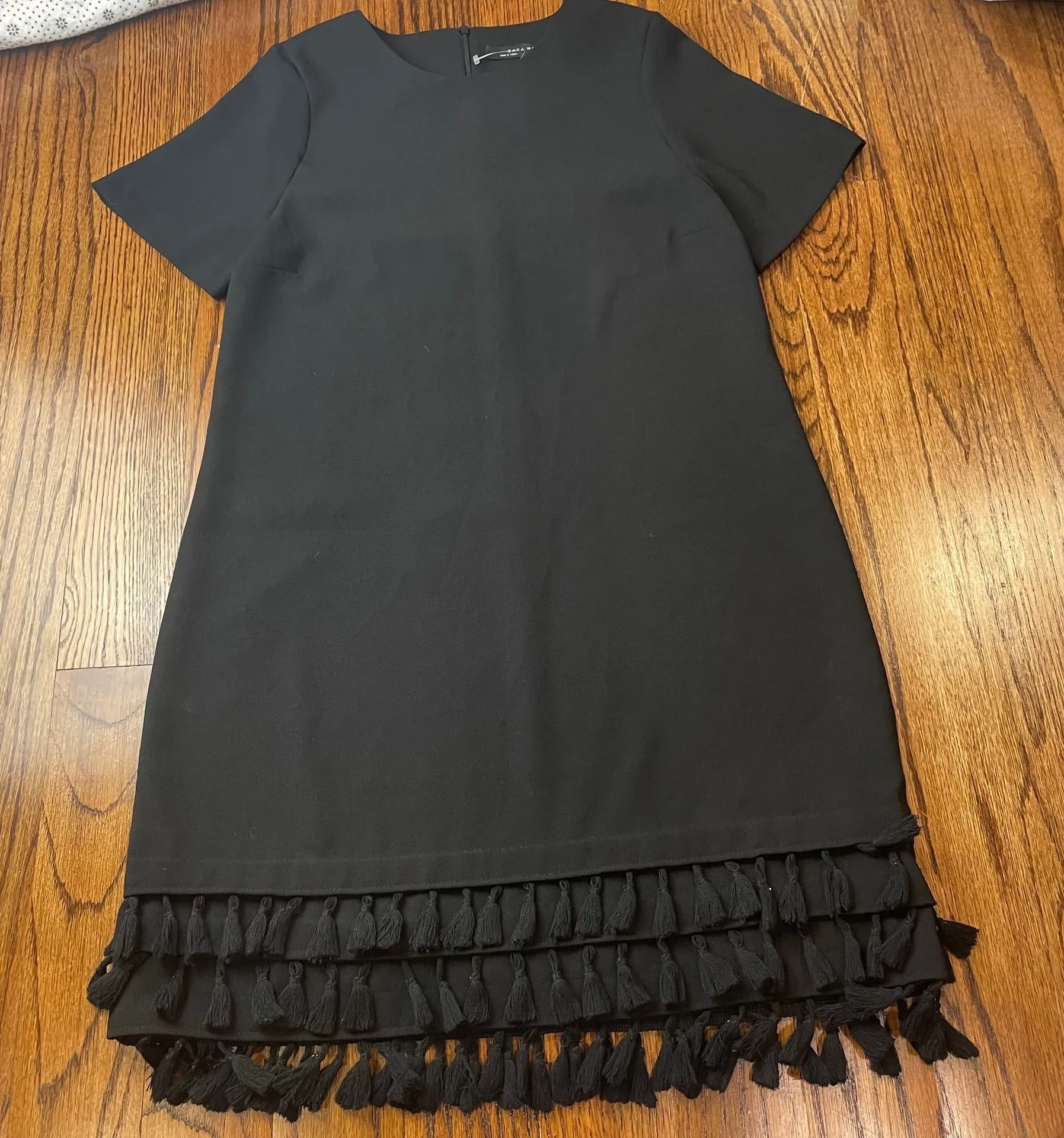 . This stylish black mini dress from Zara features playful short sleeves and an eye-catching tiered... Show more