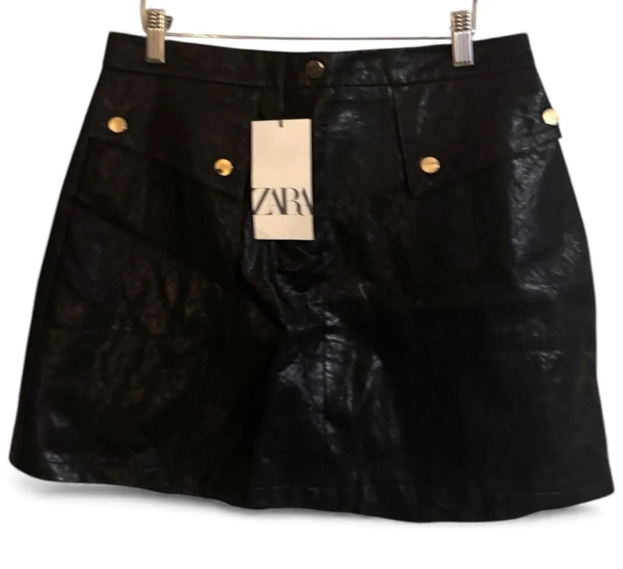 Sz L, NWT! Shiny Black Gold Hardware Vegan Leather A-Line Mini Length Flap Button Pockets, in Fron... Show more