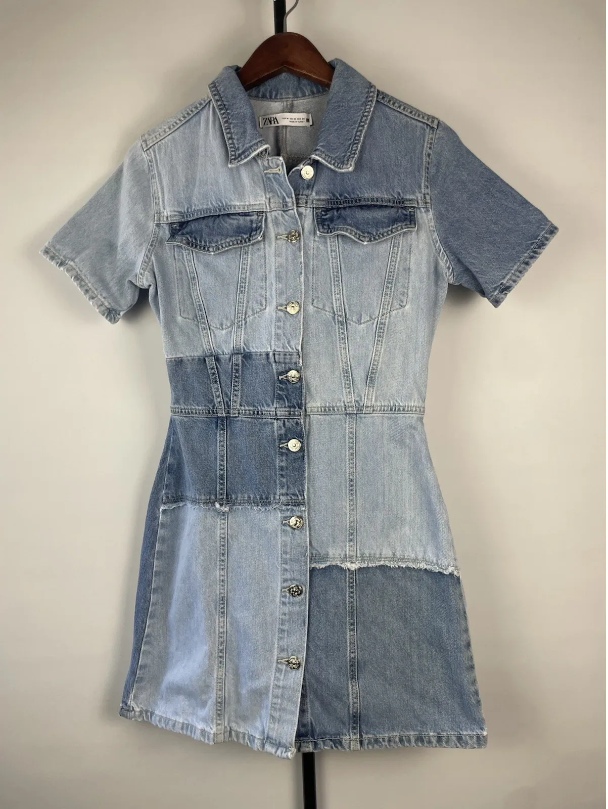 ZARA Blue Patchwork Mini Button Up Blogger Fave Denim Short Sleeve Dress Size M Nice used condition... Show more