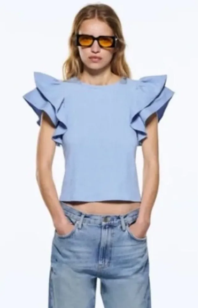 Soft and stylish Zara ribbed knit top in a pretty light blue shade. Features dramatic layered ruffle... Show more