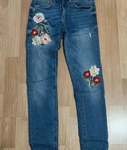 These blue skinny jeans from Zara feature a stunning floral embroidery design, adding a unique touch... Show more