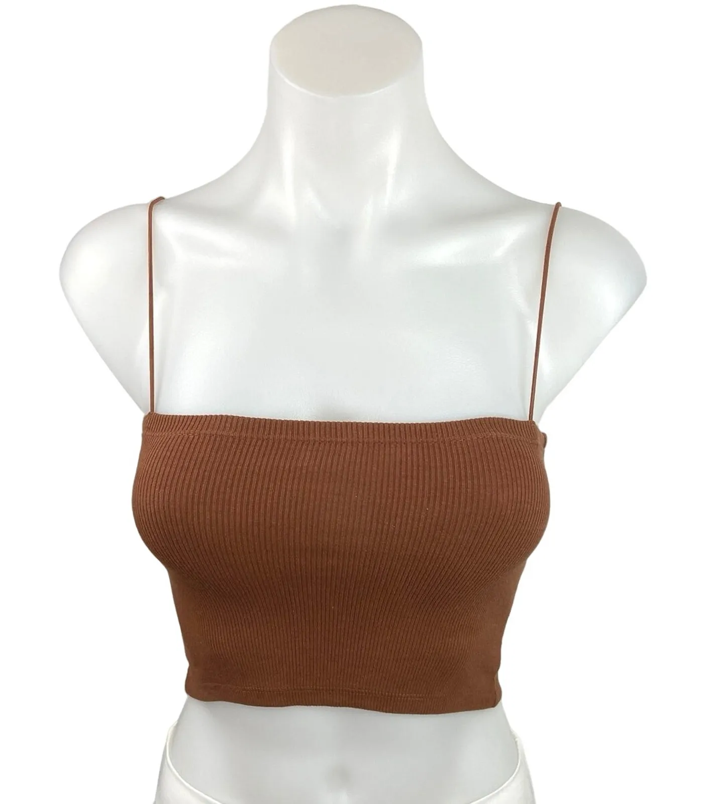 Zara Brown Ribbed Knit Square Neck Spaghetti Strap Stretch Pullover Camisole Cropped Tank Top S Siz... Show more