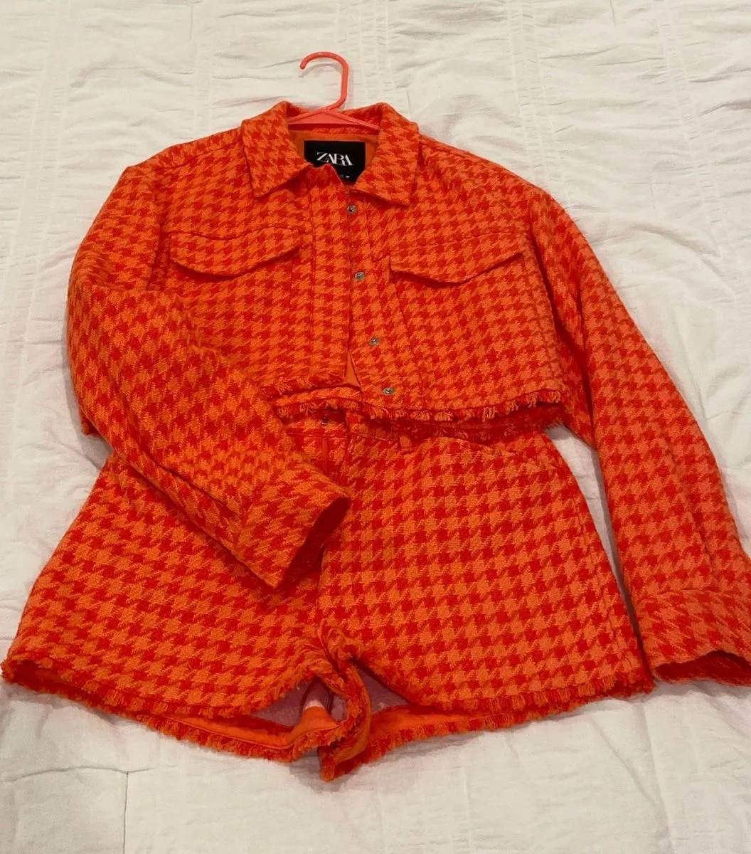 Orange houndstooth print; worn once for an event; great material; no flaws