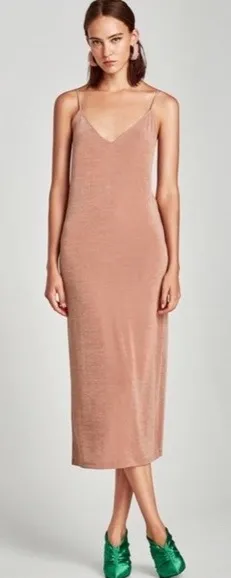 A sleek and versatile slip dress from Zara Collection. This midi-length dress features a bodycon sil... Show more