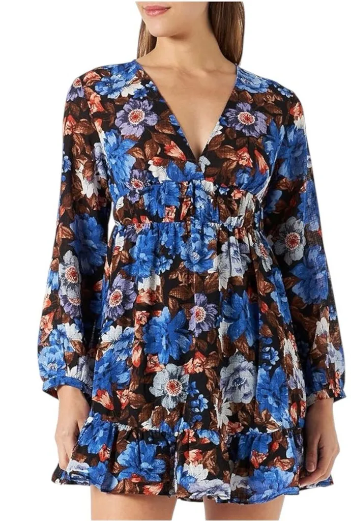 Zara Crepe Floral Print Deep V Neck Long Sleeve Ruffled Hem Mini Dress Size XL This mini dress fr... Show more