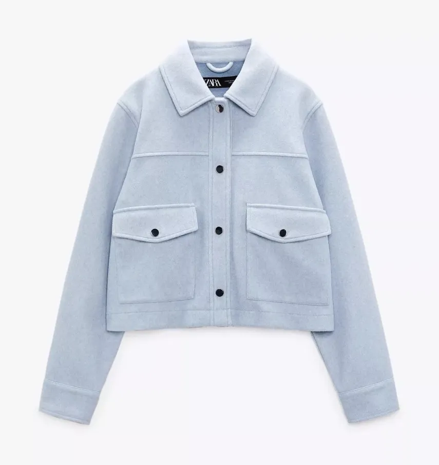 Chic light blue utility jacket. Features front pockets and button closure. Ideal for layering. Grea... Show more