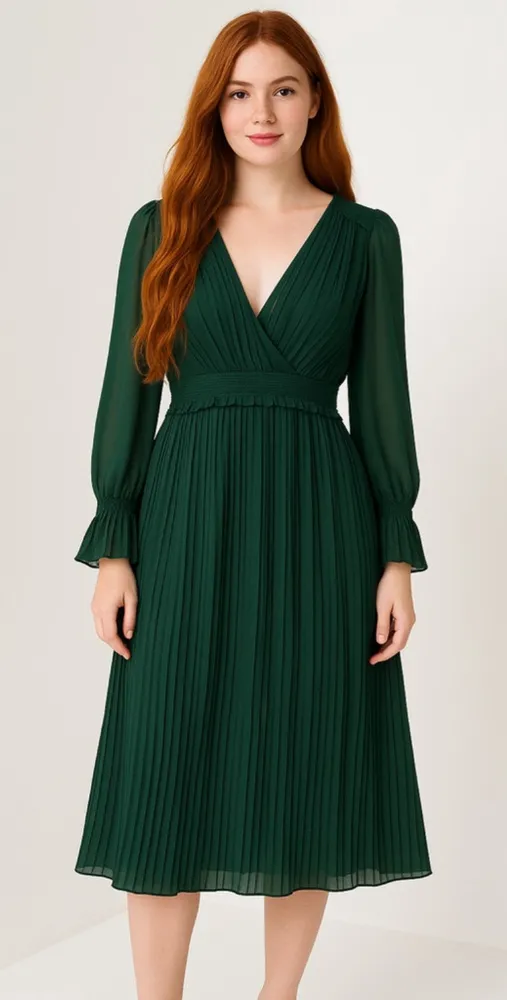 This pre-owned Zara midi dress is dark green with a V-neckline and long, sheer sleeves that feature... Show more