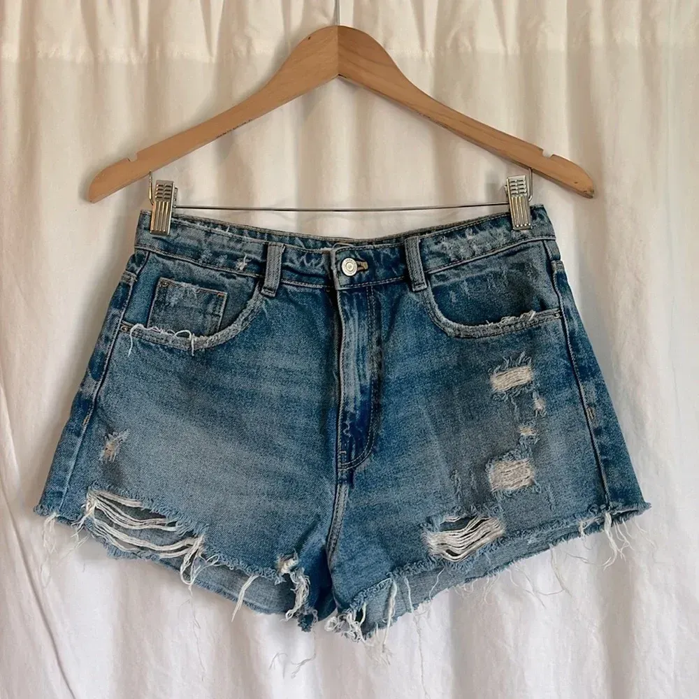 Zara - Waist: 14” - Rise: 11.5” - Length: 11” - Distressed - High rise - Cut off style - No imperfec... Show more