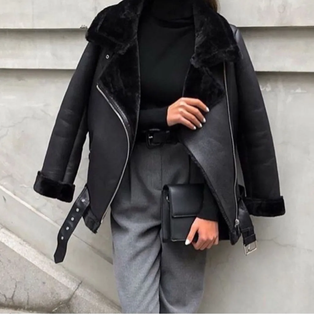 This black faux suede Aviator Bomber Moto jacket from Zara features fabulous moto / biker silhouette... Show more