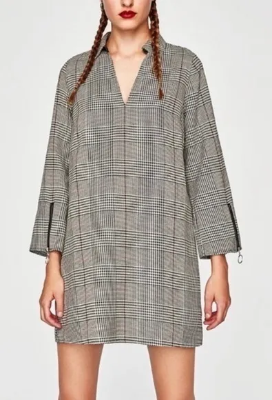 Zara Houndstooth Plaid Mini Black Ivory Dress ~ faux Leather around open collar neck ~ faux Leather... Show more