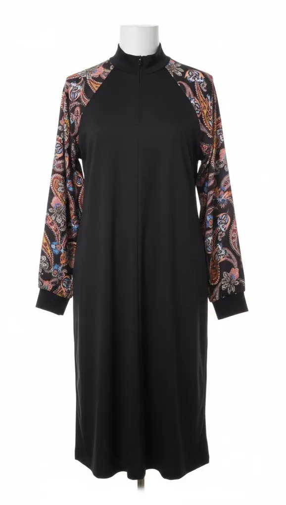 paisley print, mock neck, zip front, midi dress, long sleeve, black dress, contrasting sleeves, fall fashion, winter fashion, casual dress, High Neck, Casual, Raglan Sleeve, Colorful Sleeve, Bohemian, Boho, Retro, Streetwear, Skater, Contemporary, Travel, Vacation, Resort Wear, Festival