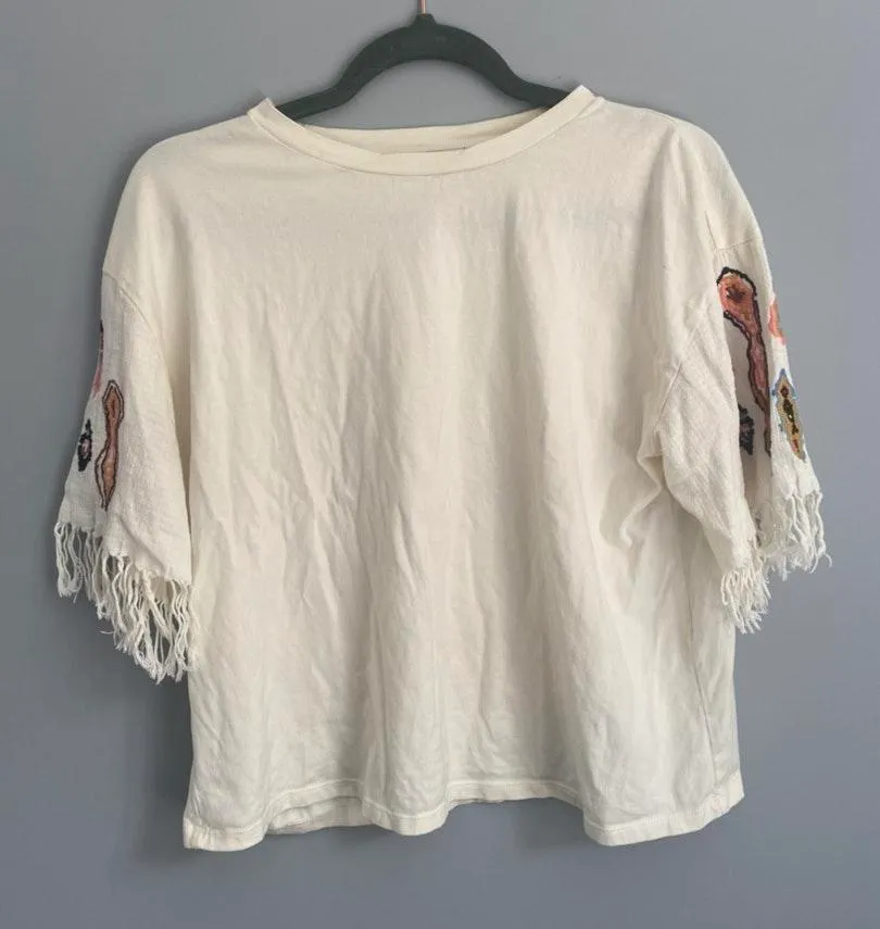Off white t-shirt with embroidered and fringed sleeves. One small stain on inside of back collar.