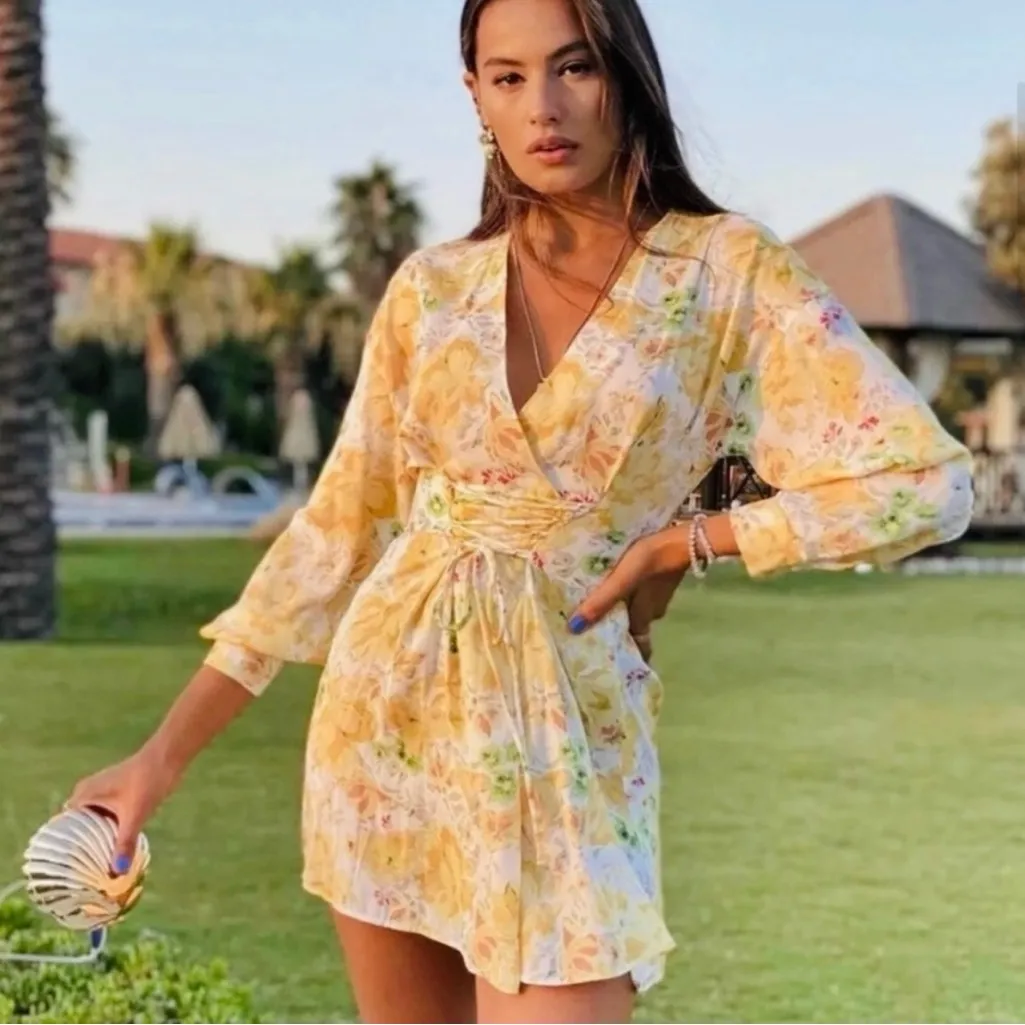 Embrace elegance with this stunning floral yellow wrap dress. Perfect for any occasion, this dress c... Show more