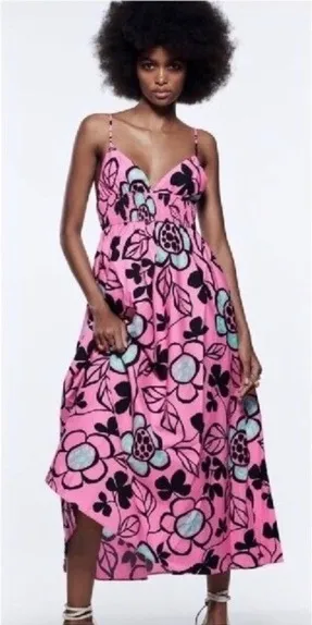 Retro floral pink midi length dress. Shirred fabric below bust, adjustable straps, hidden side pocke... Show more