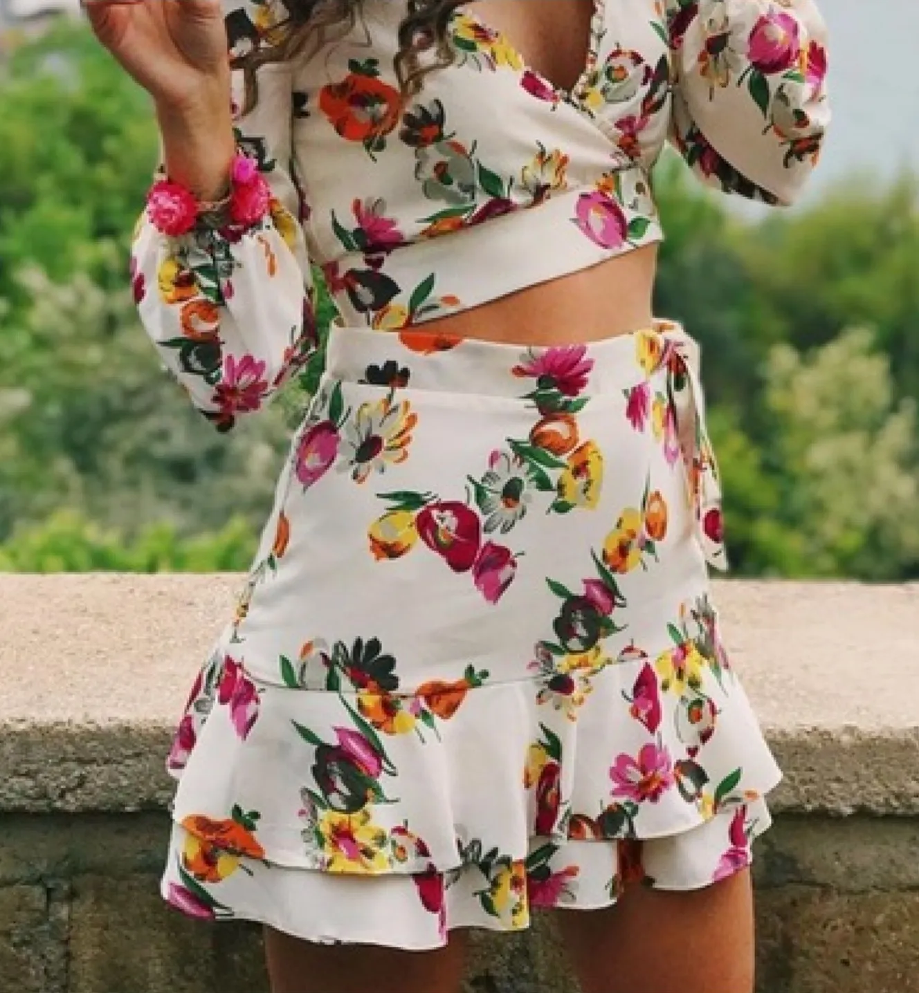 ZARA Floral Ruffled Tie Detail Mini Skirt XS White mini skirt with floral print throughout Side tie/... Show more