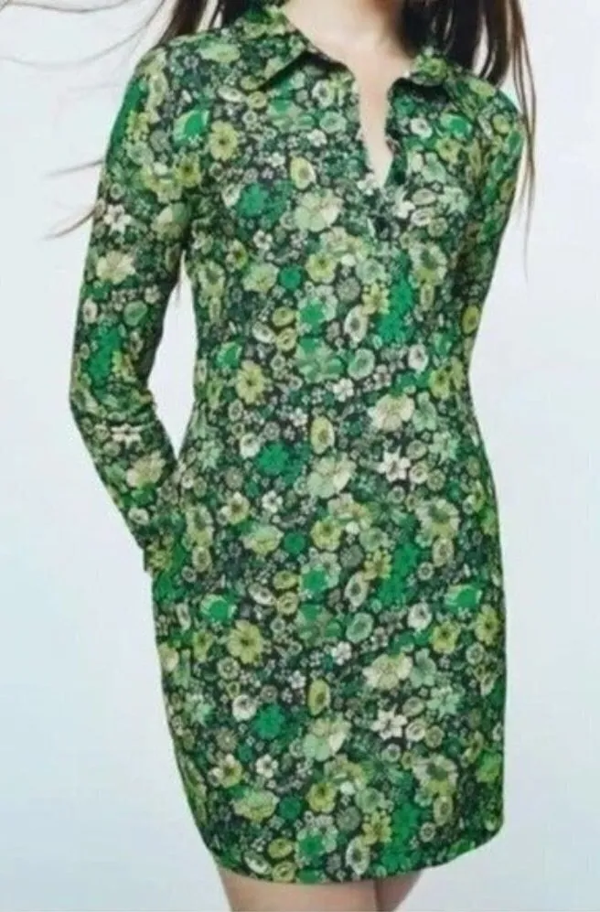 ZARA Floral Vibrant Green Print Collared Mini Dress Size S NEW Collared 1/4 Button Down Long Sleev... Show more