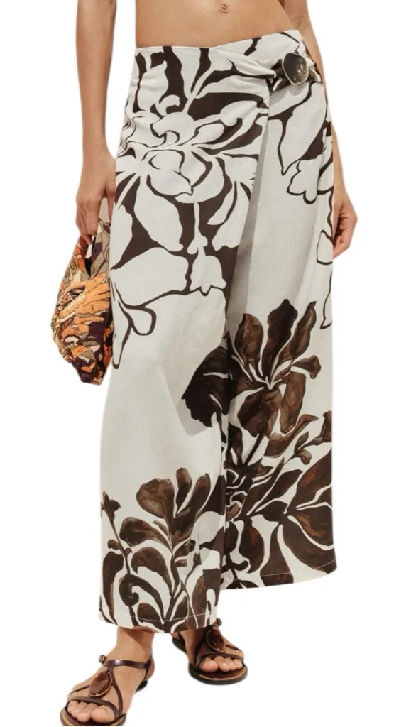 Stylish wide-leg pants with a bold floral print. Features a mix of brown and cream colors. NWOT Re... Show more