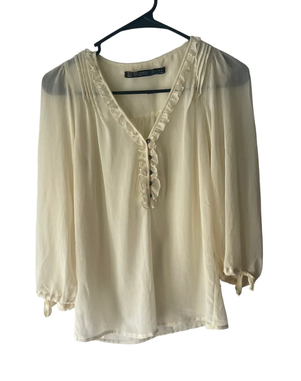 Zara Frf Collection Small Cream Ruffle Coquette Semi Sheer Babydoll Top Cottage Pit To Pit 17" L... Show more