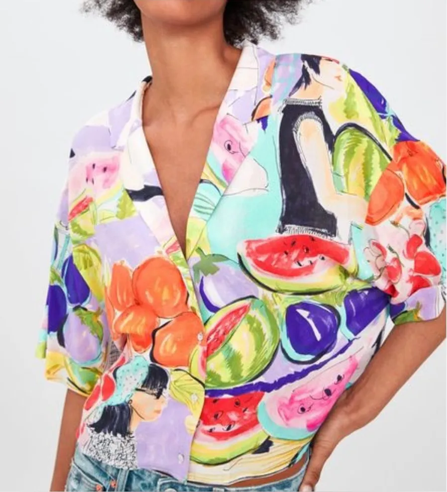 Vibrant multy color blouse with a fruit print design. style with collar, Lightweight ,oversized dolm... Show more