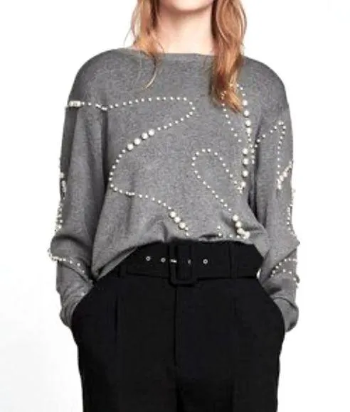 Stylish gray top with pearl embellishments. Elegant and chic design. Perfect for any occasion. Cond... Show more