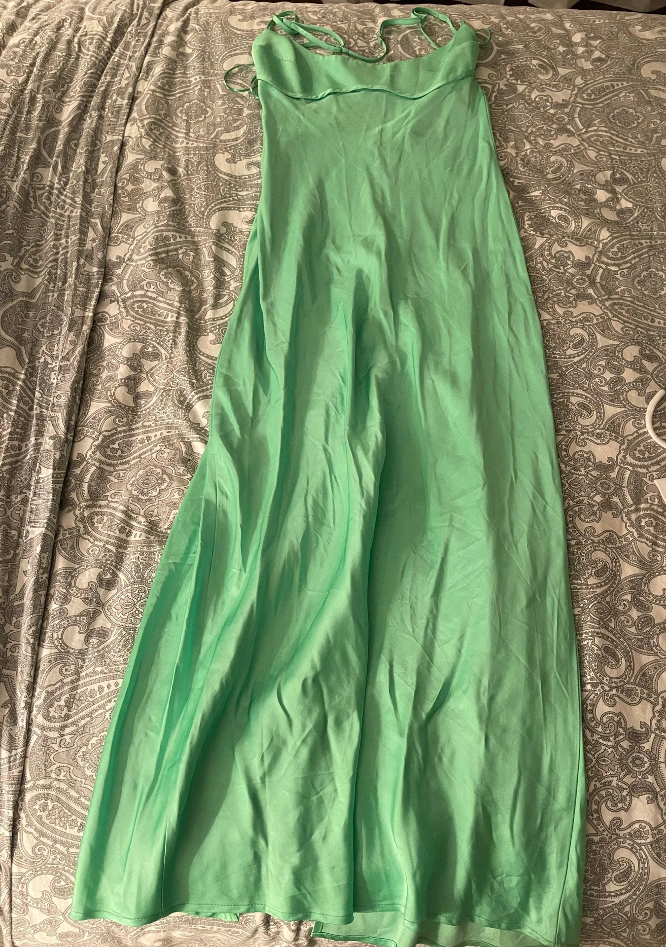 Green satin Zara dress with open back and back slit