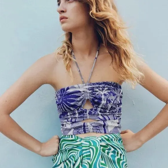 Zara halter neck crop top with cut-outs in front. Blue and white tropical pattern all over in a knit... Show more