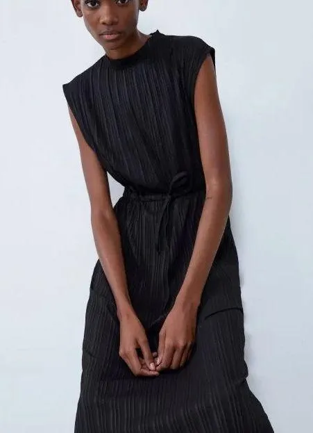 Zara High Neck Crepe Dress with Tie at Waist in Black . Brand new with tags. Mock neck with lettuce... Show more