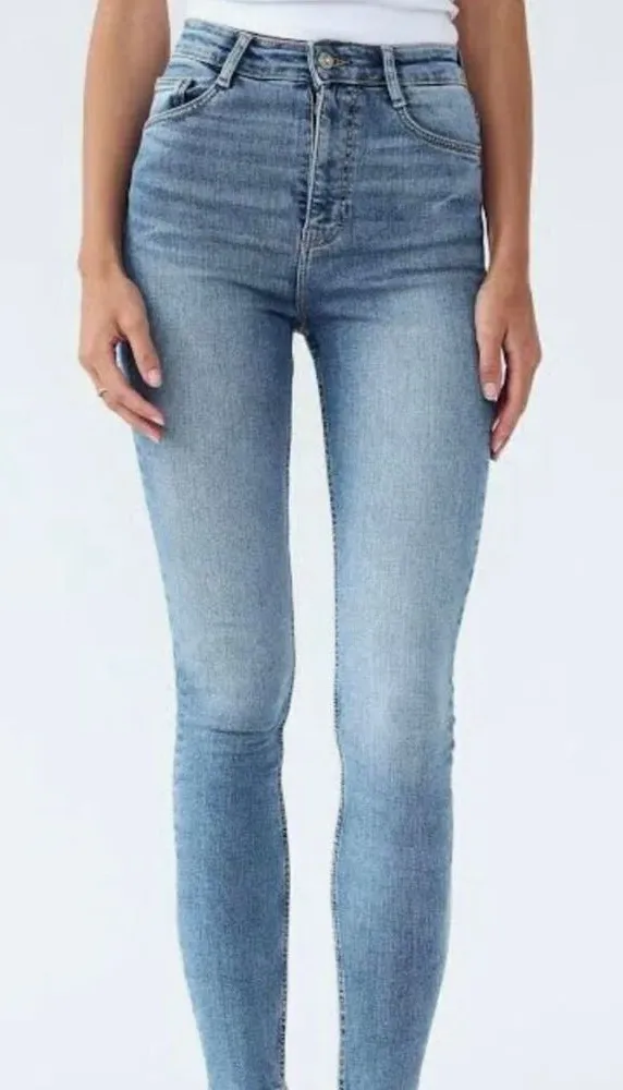 Brand: Zara Description: high rise slim raw hem jeans stretch cotton Size: 6 Color: blue medium wa... Show more