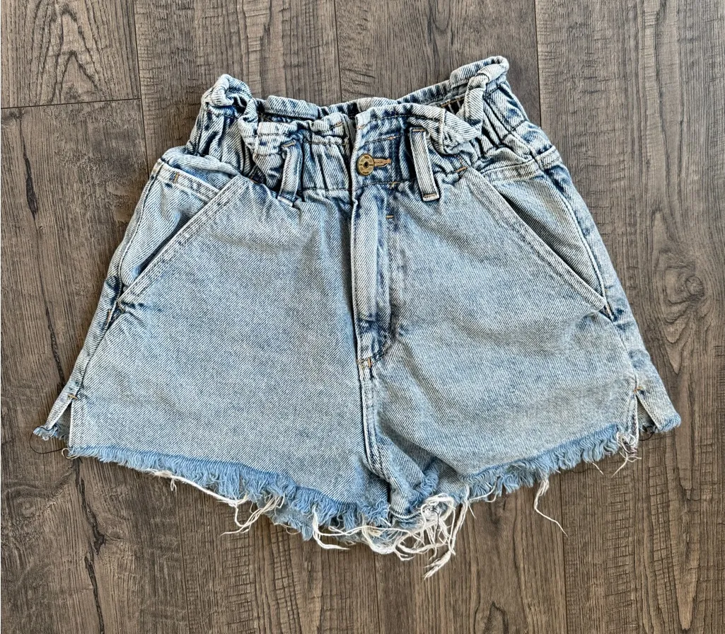 Zara High Rise Paper Bag Denim Shorts, acid wash, super stretchy waist. Size: 0 Condition: Like... Show more